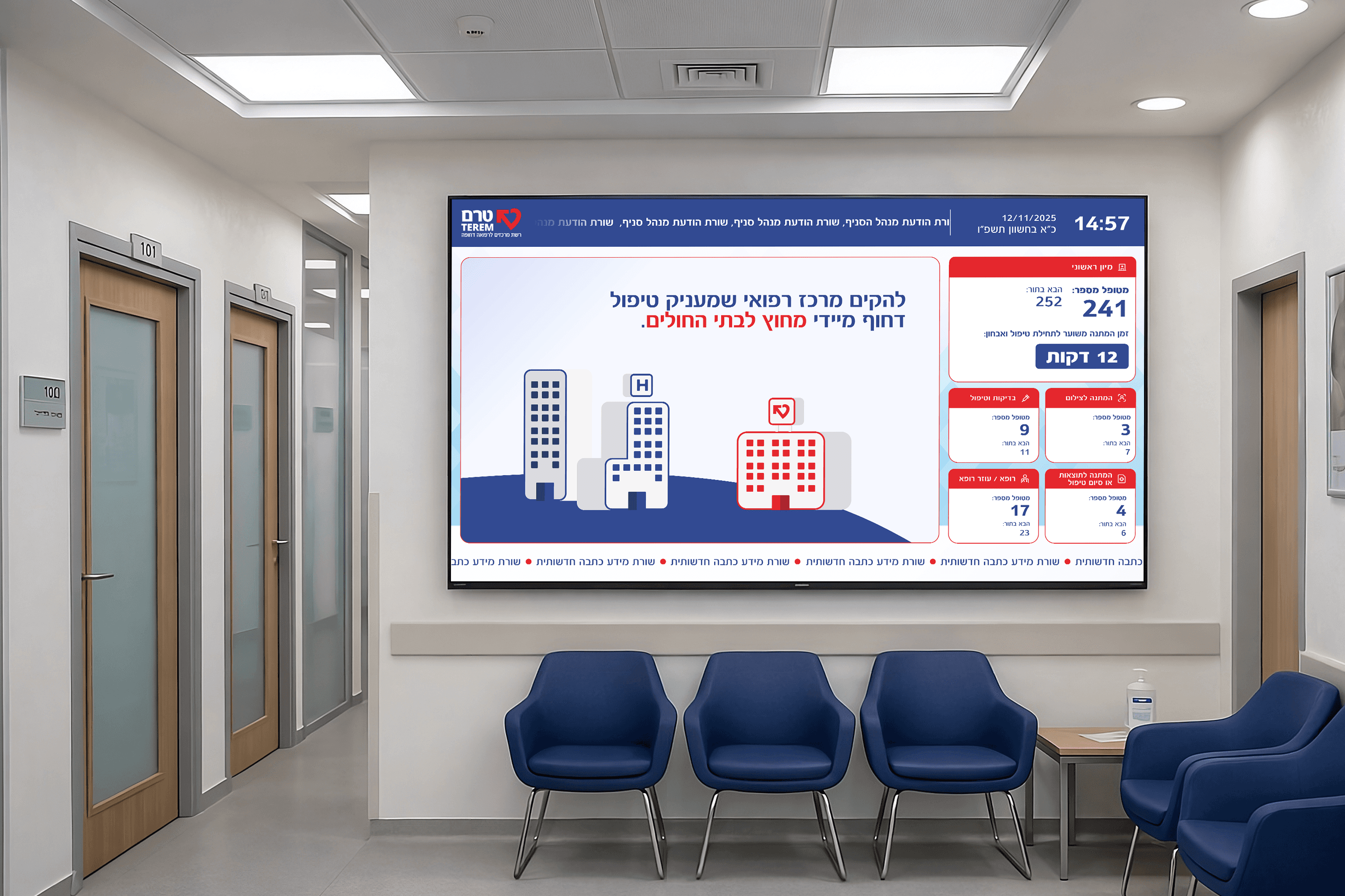 This project is a redesign of the TEREM appointment waiting screen. The update introduces a modern UI for real-time patient tracking and incorporates a media loop featuring animated brand explainer and promotional advertisements, to engage visitors while they wait.