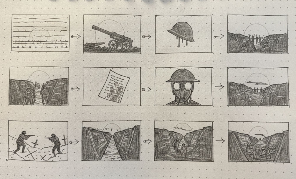 Examining WW1 Archival footage, researching clothing, equipment, vehicles, weapons, trench warfare conditions, even down to the bullet calibers used.